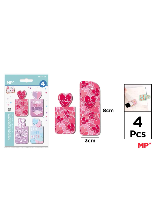 Magnetni obeleživači strana u knjigama, sveskama. U pakovanju se nalaze 4 obeleživača u različitim dezenima i veličini 3×8 cm.